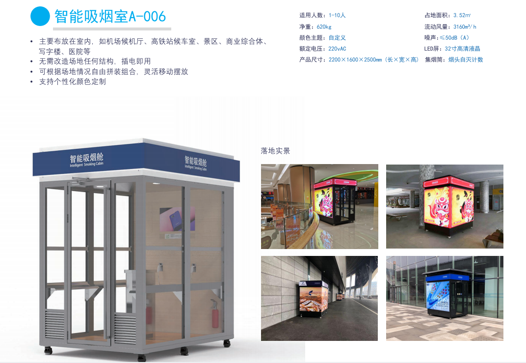 智能吸煙室A-006:主要布放在室內,如機場候機廳、高鐵站候車室、景區、商業綜合體、寫字樓、醫院等,無需改造場地任何結構,插電即用,可根據場地情況自由拼裝組合,靈活移動擺放支持個性化顏色定制。