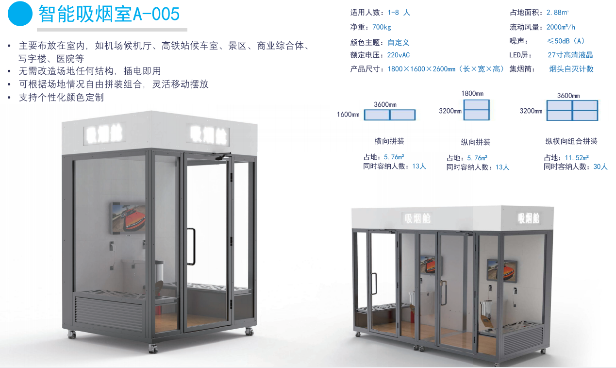 智能吸煙室A-005:主要布放在室內,如機場候機廳、高鐵站候車室、景區、商業綜合體、寫字樓、醫院等,無需改造場地任何結構,插電即用,可根據場地情況自由拼裝組合,靈活移動擺放支持個性化顏色定制。